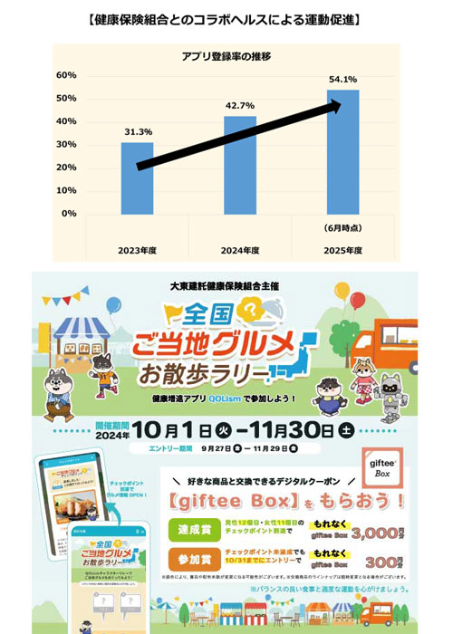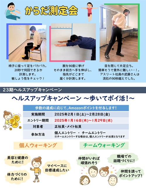 地域貢献と健康増進を目的に、街をきれいにしつつ交流を図りながら運動ができるイベント「ecoウォーク」を実施。ecoウォークとは「プロギング」を参考にしたもので、各営業所の周辺地域3~4kmほどを約2時間かけて、ゴミ拾いをしながらウォーキングを実施した。また、健康ポータルサイトで1か月間毎日8000歩を記録するとポイント付与などの参加賞がもらえる社内イベントを開催。楽しみながら運動を続けられる環境を提供している。
