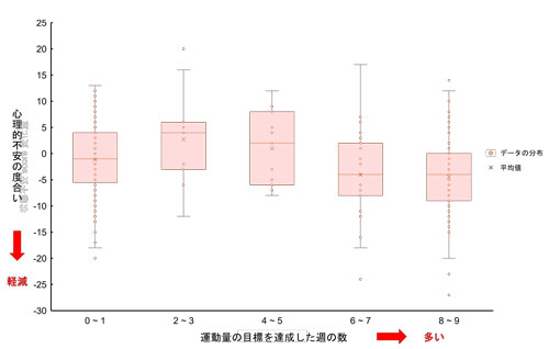 従業員のWell-being 向上を目的に慶應義塾大学と共同研究を行い、運動によって心理的不安が軽減することを実証しました。この実証結果に基づいたプログラムを提供し、従業員の運動を促進しています。2025年10 月に実施したイベントでは、1週間のうち2 日は1日1万歩以上歩くという目標を設定し、この目標を達成できるよう、参加者に2 カ月間継続してウォーキングをしてもらいました。また、アンケート調査を通じて「心理的不安の度合い」「うつ傾向」「プレゼンティーイズム値」に関する項目を測定し、イベントの前後の結果を比較することで効果を検証しました。その結果、参加者の約8 割に、一時的な不安の度合いを表す「状態不安」の軽減が見られたほか、目標を達成した週が6 週以上となった参加者は、目標を達成した週が6週未満となった参加者と比べ、すべての項目で数値が改善する傾向が見られました。