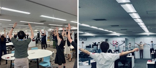 13 年目を迎えたJAL「本気の!ラジオ体操」は、ウエルネス推進部では毎日継続して実施しています。今年度も、4月から10 月にかけて本社及び羽田空港内の当社人財本部や成田空港内の当社オフィスで毎月1回実施しています。社内フィットネストレーナーが直接現場へ出向き、正しい身体の使い方を指導することで、疲労軽減と職場環境の活性化を図っています。参加社員からは「始業前に全身を動かすことで心身ともにスッキリし、前向きに業務に臨める」と好評を得ており、JAL独自の健康文化として根付いています。