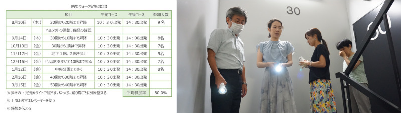 オフィスのある30階から20階への昇降など、事前に防災担当がコースを考え実施。屋外の避難経路の学習も視野に入れている。メンバーの体力増進につながるとともに、ビルの構造や周辺の地図の理解にもつながっている。